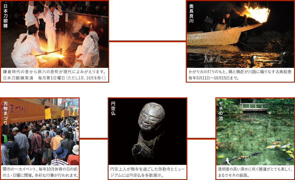 日本のほぼ中央に位置する関市、その名は市内にあった「濃州関所」に由来しています。鎌倉時代から続く刃物造りの歴史を学べる「関鍛冶伝承館」をはじめに、数々の施設やミュージアムで「刃物の町」の歩みと現在を知ることができます。関の刀匠の祖・元重の遺徳をしのんで、毎年秋に開催される「刃物まつり」には国内外から数多くの観光客が訪れ、大変な賑わいとなります。清流長良川での古式ゆかしい「小瀬鵜飼」、12万本の木彫りの仏像を彫りながら全国を行脚した「円空上人」終焉の地でもある関市は、自然と伝統文化が豊かな町でもあります。